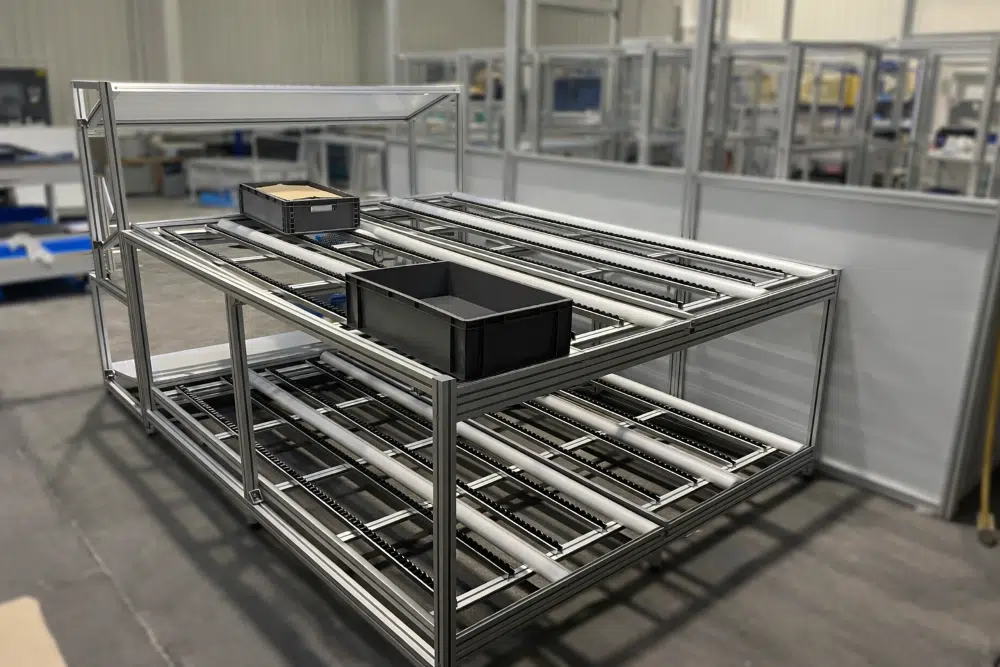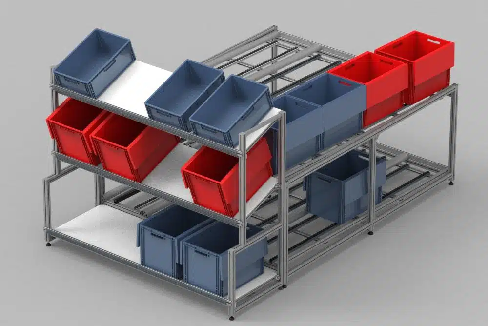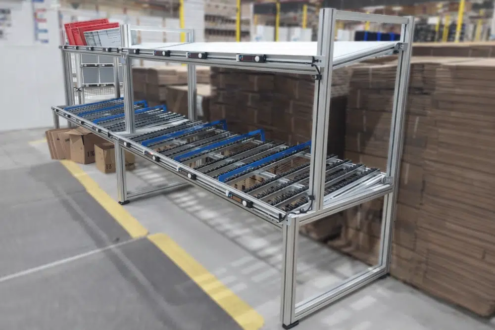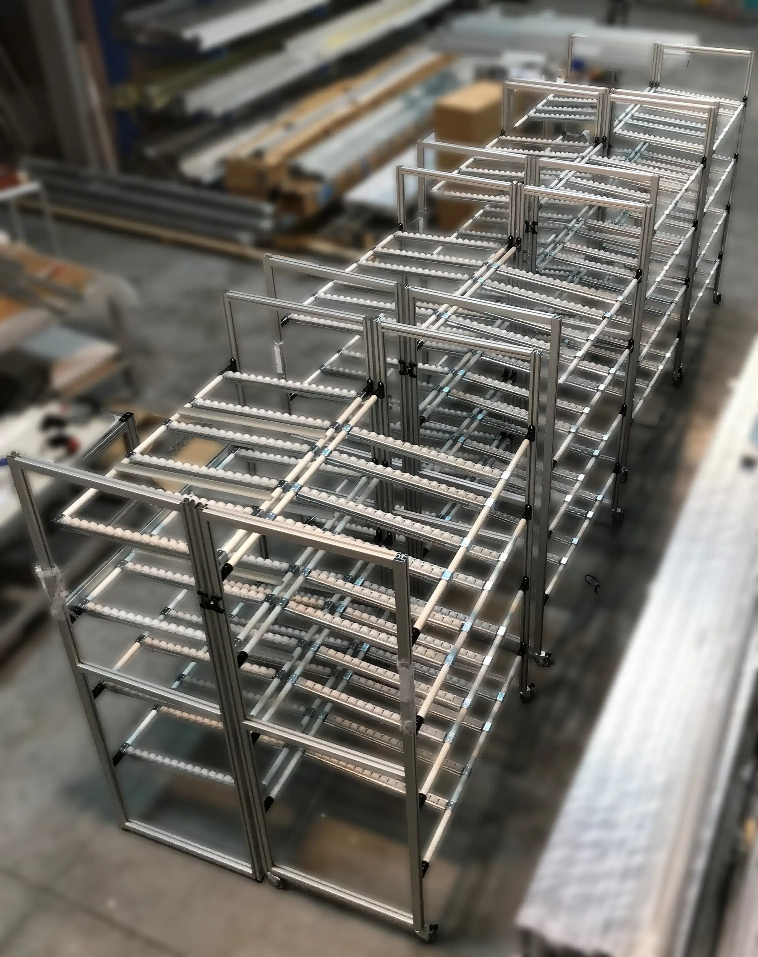 SYSMO conçoit des racks dynamiques sur mesure en profilés aluminium équipés de rails à galets ou à rouleaux inclinés. Cette structure modulaire permet un stockage dynamique pour bacs, cartons et contenants, adaptés aux cadences élevées et aux environnements industriels exigeants. Le rack FIFO aluminium garantit une rotation optimale des stocks, améliore la productivité des opérateurs et facilite la gestion efficace de vos marchandises.