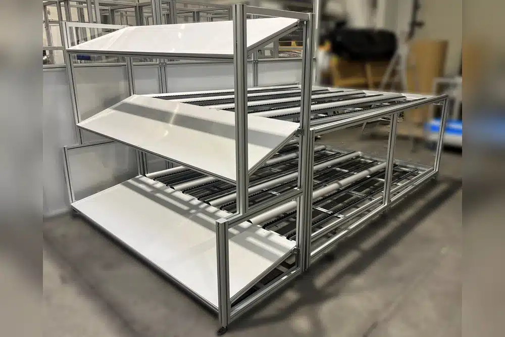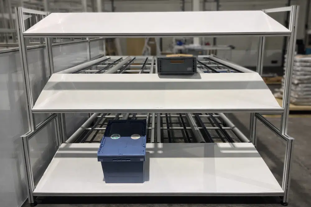| 🧩 Modularité | Structure en profilés aluminium évolutive, ajout de niveaux et adaptation aux contenants (bacs, cartons). |