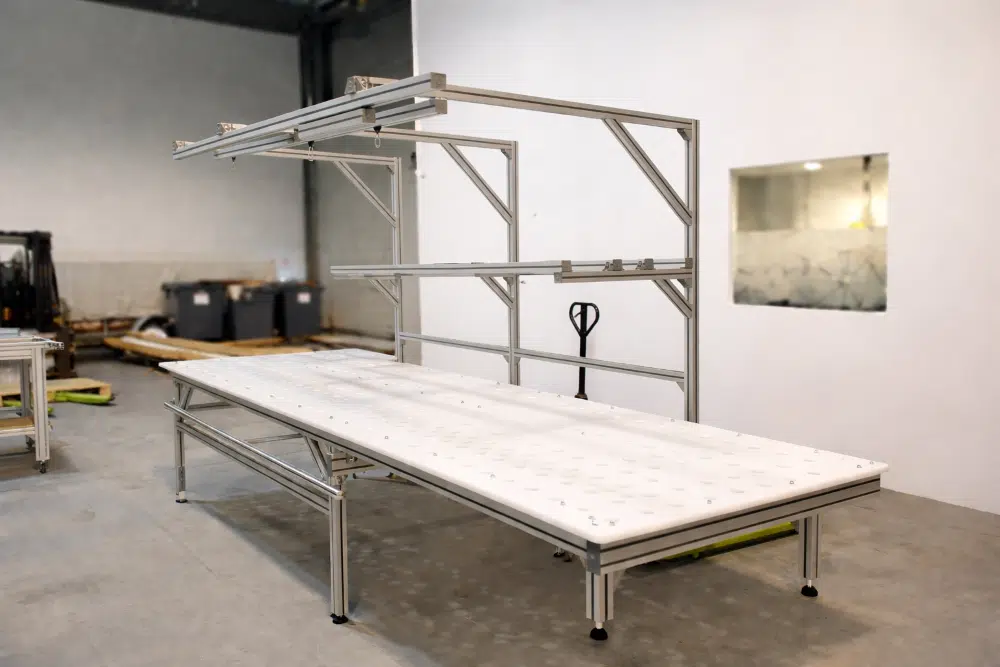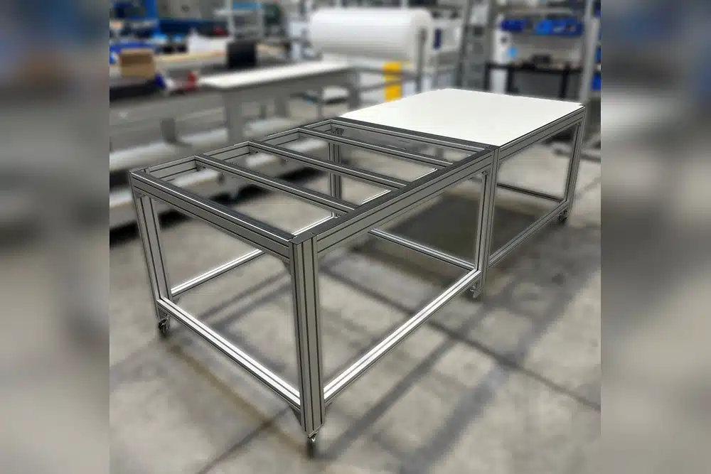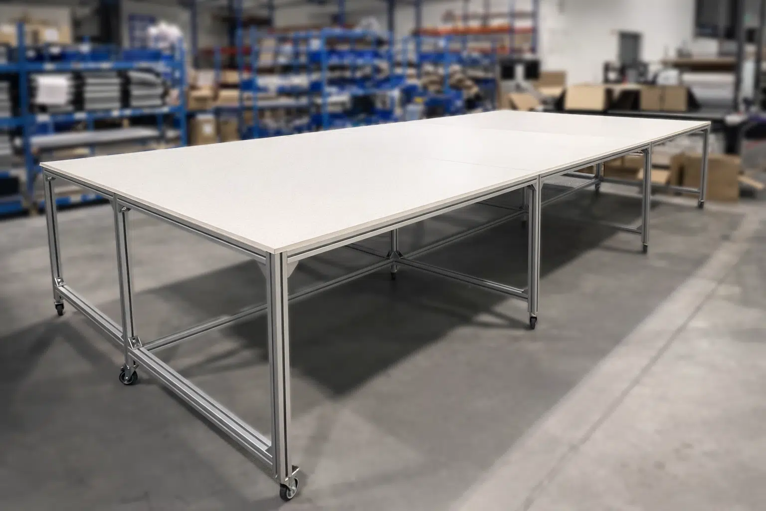 Pour un montage facilité de produits volumineux, SYSMO conçoit des tables creuses ou semi-creuses dont le plateau ne recouvre pas totalement la surface. Ce type de table est très utilisé pour l’assemblage de châssis métalliques, d’ossature bois pour la construction, de menuiseries aluminium ou PVC, ou de structures nécessitant un accès au centre du plan de travail. Cette configuration facilite le positionnement des pièces, permet l’utilisation de systèmes de serrage spécifiques, et améliore l’accès aux zones d’assemblage. La structure en profilés garantit la rigidité nécessaire malgré l’absence de plateau continu.