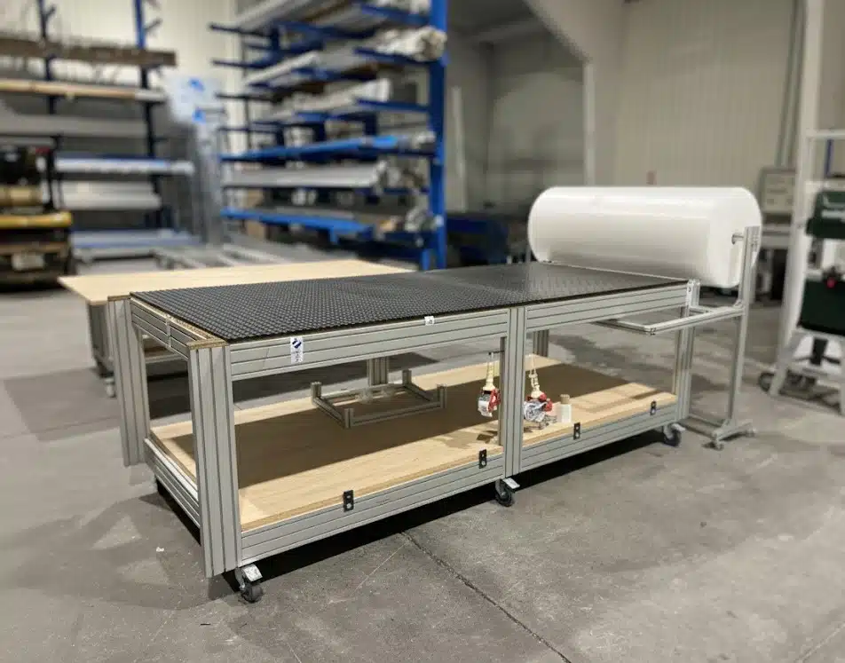 Plateau bois renforcé ou stratifié compact selon la charge, structure aluminium dimensionnée pour garantir la stabilité. |