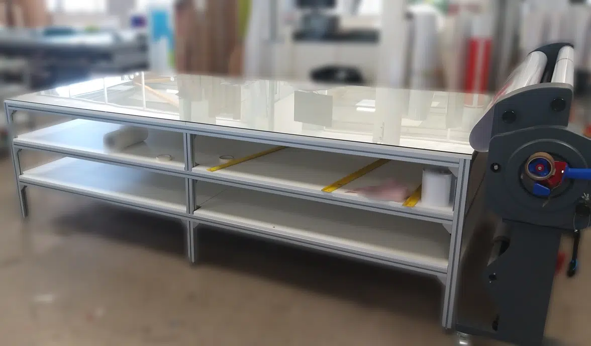 Les matériaux utilisés assurent une tenue dans le temps même en usage intensif quotidien. La structure en profilés aluminium résiste aux chocs et aux charges, le plateau bois ou stratifié supporte les opérations répétées d’emballage, et les accessoires industriels garantissent la durabilité des équipements. Cette solution robuste offre un excellent retour sur investissement et limite les coûts de remplacement sur le long terme.