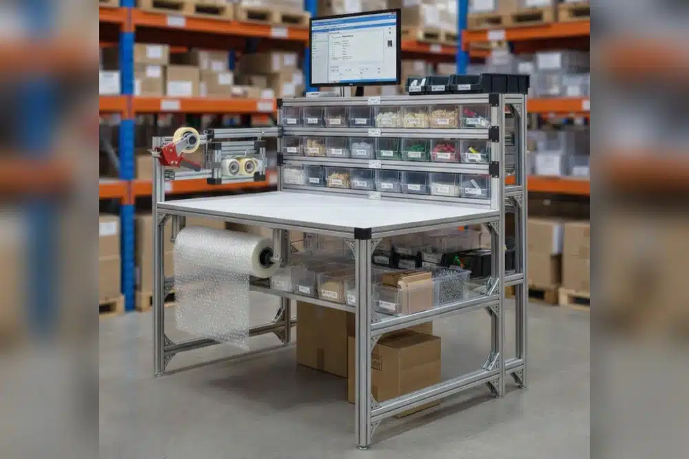 Dans les centres de distribution e-commerce, la table de préparation optimise les opérations de picking multi-références et d’emballage. Les opérateurs regroupent les produits d’une commande, sélectionnent l’emballage adapté et conditionnent rapidement grâce aux accessoires à portée de main. Cette organisation améliore la cadence de préparation et réduit les erreurs de conditionnement. Le poste de travail ergonomique limite la fatigue lors des pics d’activité saisonniers.